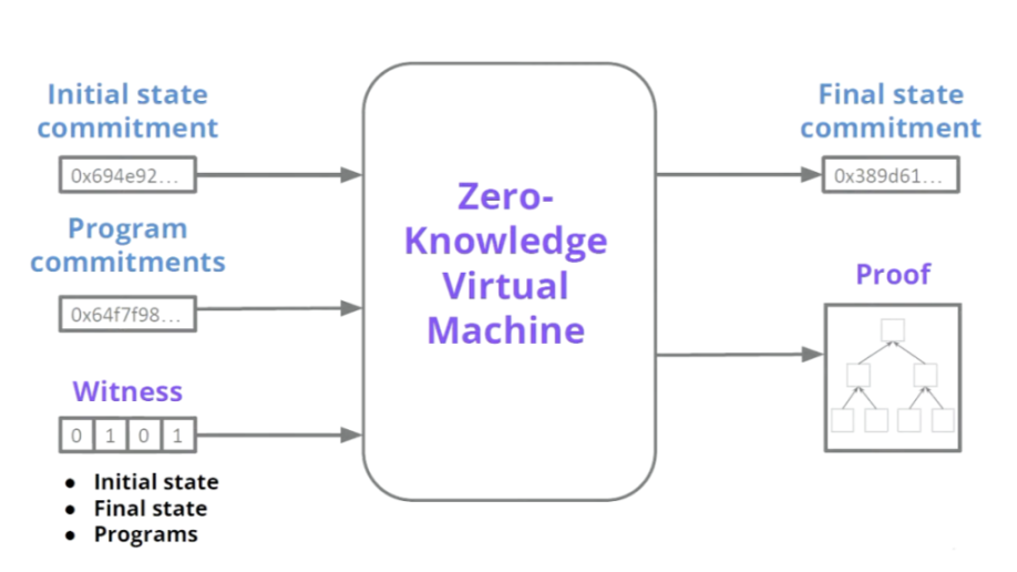 zkVM 是一种虚拟机,通过零知识证明,可以确保可信特征的安全性,即,输入原来的状态和程序将输出新的状态。