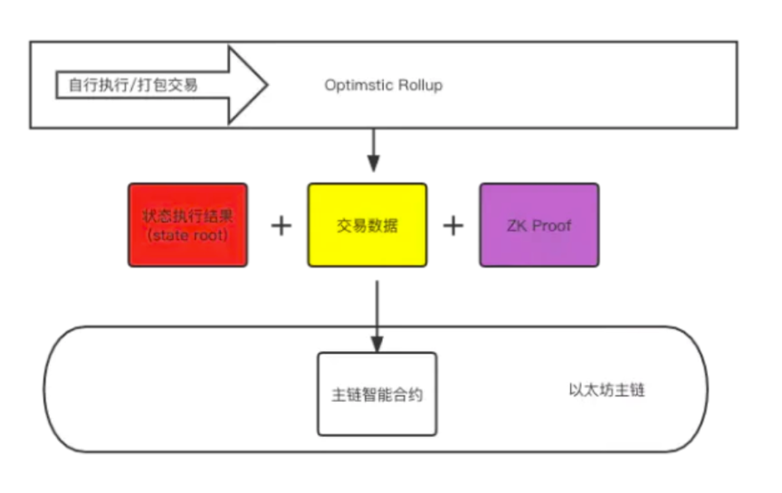 下图是简化版的 Zk Rollup 的图解。增加了 ZK Proof,减少了验证人。