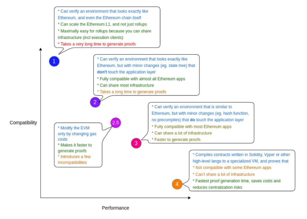 Polygon、ZKSync 和 Scroll 和 Privacy and Scaling Explorations 团队、Nicolas Liochon 的团队以及 Cairo 的 alpha 编译器都在最近发布了公告。本文将尝试描述 EVM 等价的不同类型的分类和每种类型的好处和成本。