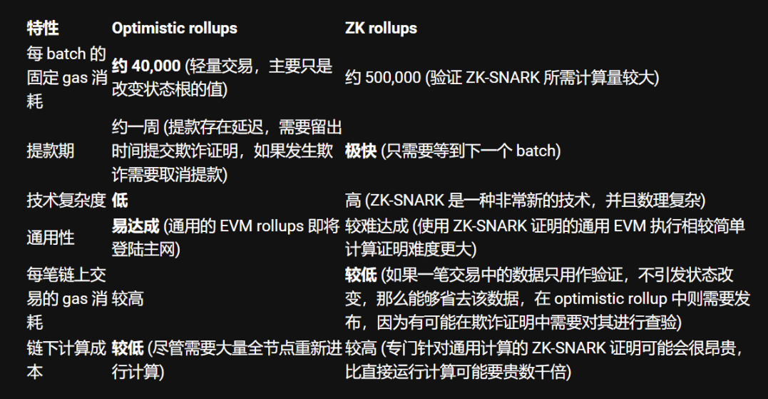 下表是 Vitalik 文章中对于两种不同 Rollup 的对比。