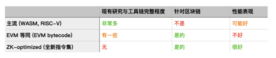 主流的 zkVM 分三类,分为主流 (WASM, RISC-V)、EVM (EVM bytecode)、ZK-Optimized ( 全新指令集, 针对零知识证明所优化, 比如 Cairo 和 zkSync),下图为三者的对比图: