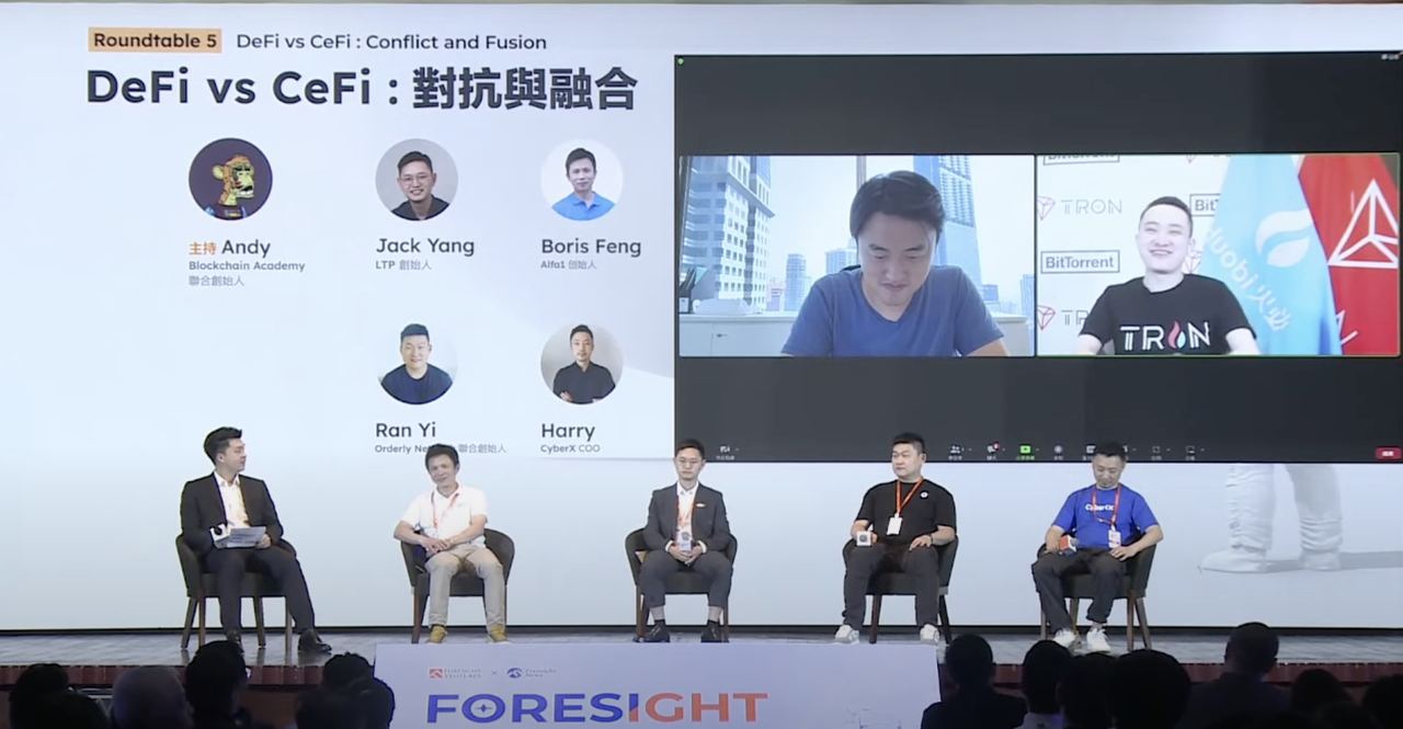 4 月 10 日,由 Foresight Ventures 与 Foresight News 联合主办的「FORESIGHT 2023 」年度峰会上,在《DeFi vs CeFi :对抗与融合》圆桌论坛中,Amber Group 联合创始人 Michael Wu、波场 TRON 创始人孙宇晨、LTP 创始人 Jack Yang、Alfa1 创始人 Boris Feng、Orderly Network 联合创始人 Ran Yi、CybeX COO Harry 与主持人 Andy(Blockchain Academy 联合创始人)共同讨论了 CeFi 与 DeFi 未来的发展机遇。