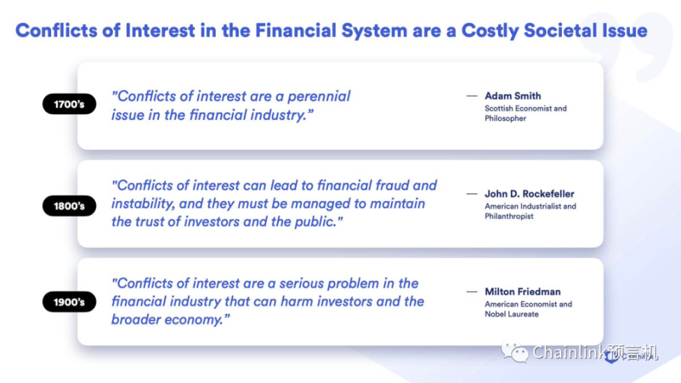 • 所有金融体系的一个关键问题是它们无法解决利益冲突,这使更强大的群体总能从更弱势的群体那里窃取资金。这种利益冲突问题是所有受金融市场支持的经济体中长期存在的问题。
