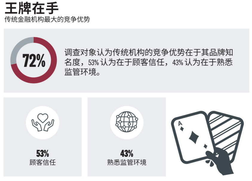 根据《哈佛商业评论》发布的《挑战与变革:传统金融机构拥抱金融科技挑战》调查报告,传统金融机构的竞争优势主要在于品牌知名度、顾客信任和熟悉监管环境等方面。然而,随着有许可去中心化金融的出现,可以迅速获得顾客信任且能满足监管环境的要求,传统金融机构的优势将瞬间消失。因此,传统金融机构也在不断探索有许可去中心化金融的应用潜力。随着监管机构对加密货币和 DeFi 态度逐渐趋向积极,有许可去中心化金融将有更多机会得到监管机构的认可和支持,或许成为逆境下的唯一出路。