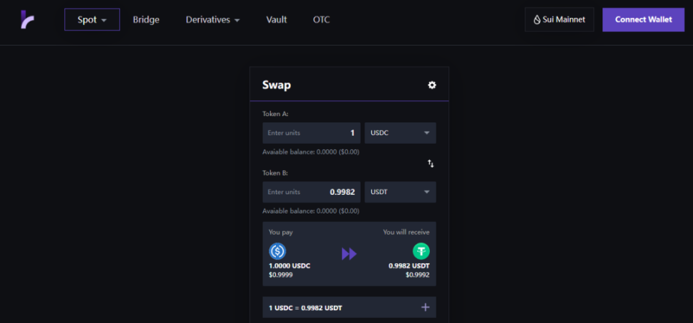 Kriya 是一个集现货交易、永续合约、期权和 OTC 交易为一体的 DEX,但目前只有现货交易上线 Sui 主网,其他功能还在测试中。目前该协议的 TVL 只有约 4 万美元。