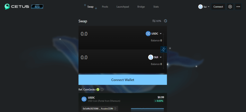Cetus 目前是 Sui 主网上 TVL 最高的 DEX(1500 万美元),具有单币质押和 LP 挖矿功能。曾入选 Sui 第二轮开发者资金项目,种子轮由 OKX Ventures、KuCoin Ventures、NGC Ventures、Animoca Ventures 等投资。