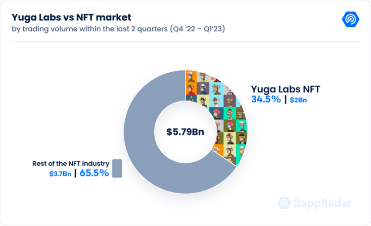 Yuga Labs 16 个 NFT 收藏品占整个 NFT 行业的 34.6%,过去 2 个季度的总交易量为 20 亿美元。