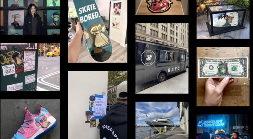 于是大量延伸的作品很快诞生了。穿的、玩的、看的、甚至是还有吃的,涵盖娱乐、音乐、时尚、游戏和虚拟世界在内的多个领域。团队还资助其中使用猿猴 IP 的创业者,鼓励他们发挥创造力,扩大品牌影响。而这种自下而上的方法,让每个使用猿猴形象做自己商业产品的人同时参与 Yuga 的品牌建设。一众社区成员都在通过各种方式给这个社区和品牌赋能,就像一个社区版的 Supreme,创造着自己的文化。