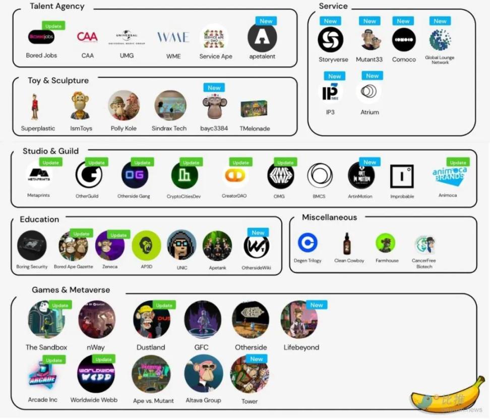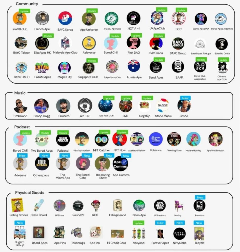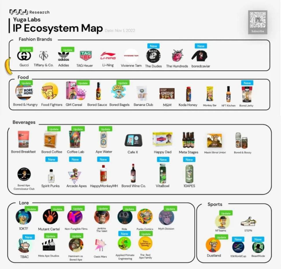 根据 Bitpush News 的资料显示,Yuga Labs 的 IP 生态系统快速增长:数量从 22 年 8 月份的 80 增长到现在的 200+。