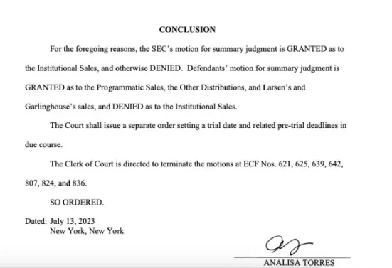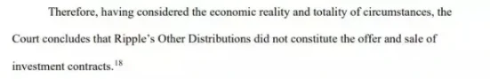 最终,法院作出 Ripple 的程序化销售 XRP 不构成投资合约,不违法证券法。并且,法院还裁决使用 XRP 对其他人的投资、赏金、赠款以及向高管转让等均不构成投资合约,不违法证券法。