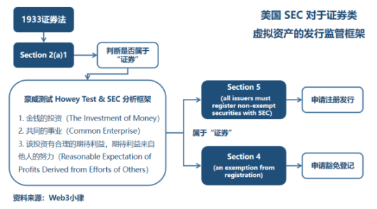 法院关于「证券」的认定,依然遵循豪威测试(Howey Test)的标准。豪威测试是美国最高法院在 1946 年案件 SEC v. W.J. Howey Co. 裁判中使用的一种判断交易是否构成「投资协议」的标准,其他形式的利润分享协议,它还包括「投资协议」。所以,如果特定交易满足豪威测试的标准,那么该交易将被视为美国法律体系下的「证券」,需要遵守美国 1933 年《证券法》和 1934 年《证券交易法》的相关规定。