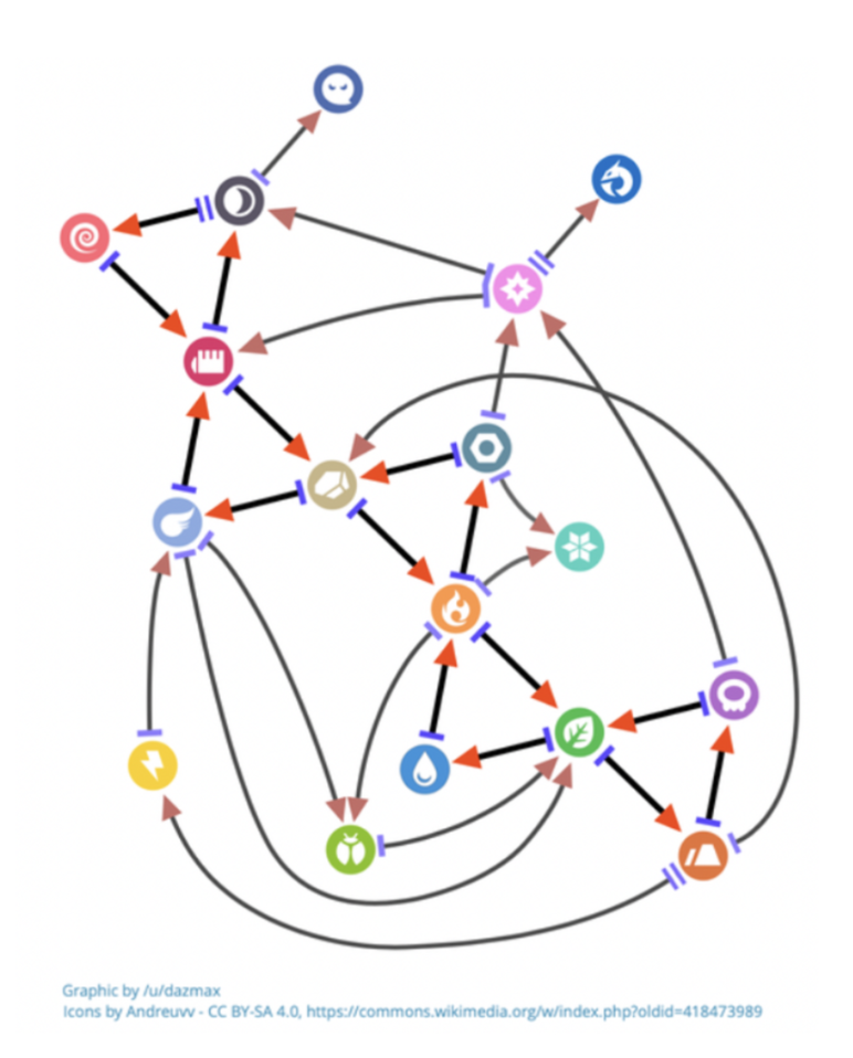 以口袋妖怪(Pokemon)视频游戏世界为例,类型系统描述了这些数字世界的数字物理学的子集。在下图中,口袋妖怪(Pokemon)世界的类型系统被表示为有向无环图(directed acyclic graph),其中箭头的方向表示类型对抗的方向。