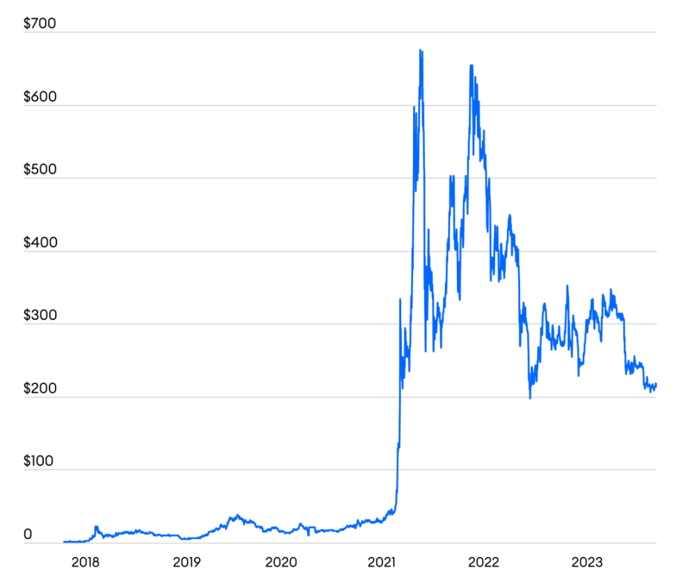 尽管如此,币安面临的最大问题可能还是交易量的减少,因为从 2022 年开始一直到现在,数字资产市场仍在加密货币的寒冬中挣扎。这为币安发行的加密货币 BNB 带来了沉重的压力,自 2021 年 5 月达到历史高价 675 美元以来,BNB 的贬值幅度已达 68%。
