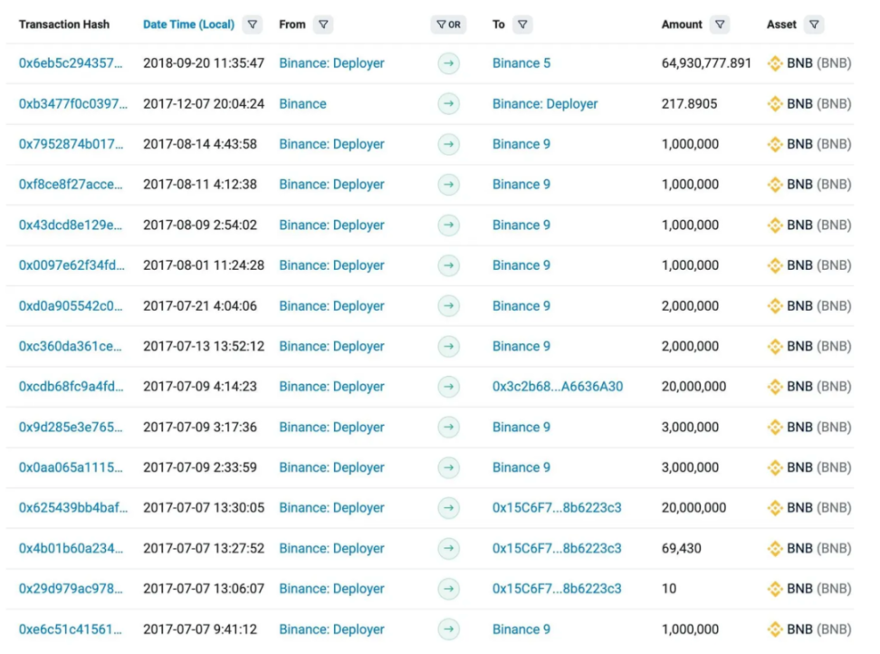 部署者钱包(来自币安部署者钱包的 BNB 交易列表,包括在 ICO 一年多后的 2018 年 9 月转移了近 6500 万枚代币。)