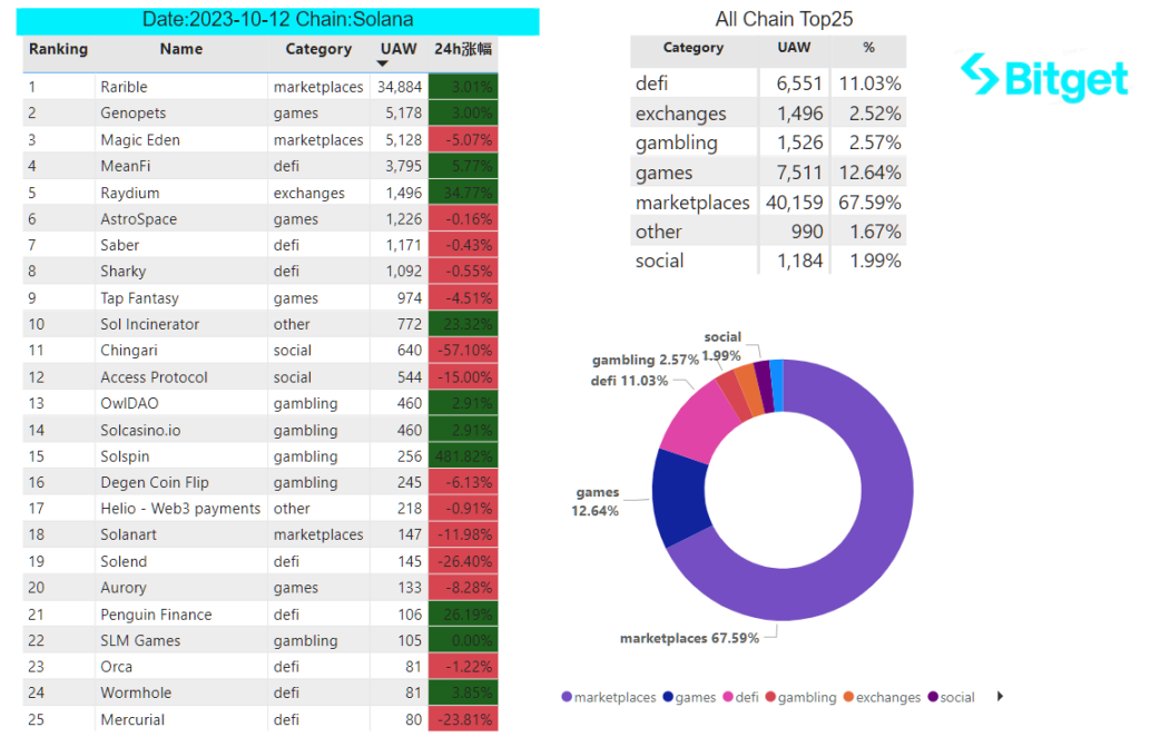 Solana 生态中没有新的热门协议出现,两个 NFT Marketplace: Rarible 和 Magic Eden 稳居 UAW Top2;