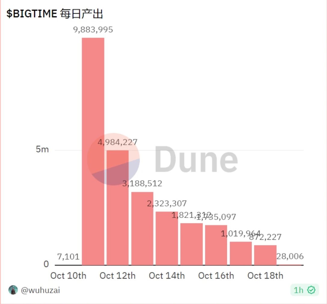 根据 Dune 中 wuhuzai 统计 Bigtime 代币每日打金量来看,如下图:
