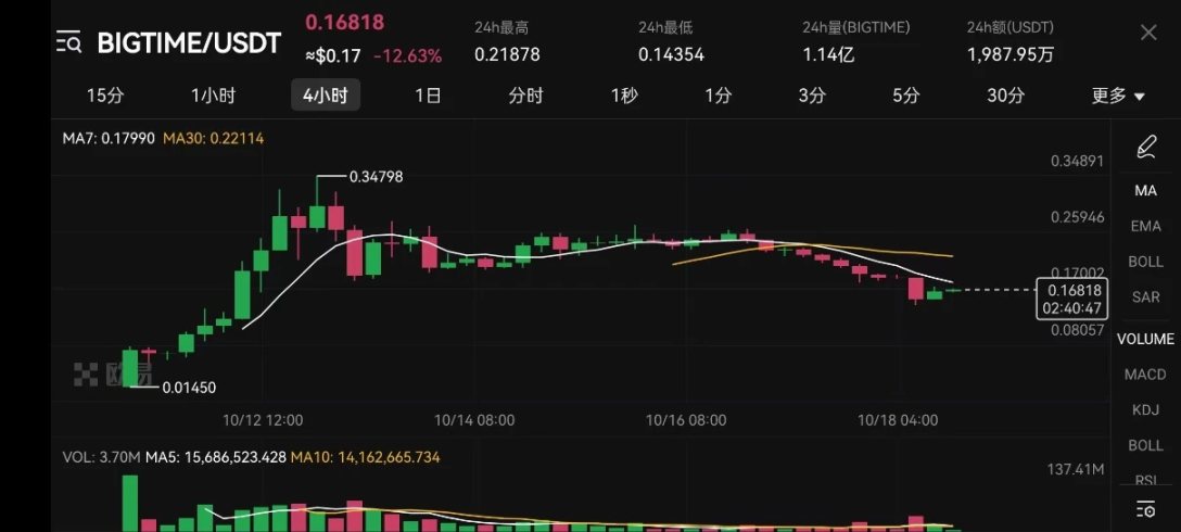 从下图 Bigtime 价格走势来看,前几天的币价猛涨,和上线顶级交易所的时间节点相同。初始价 0.01 USDT,最高涨至 0.34 USDT。