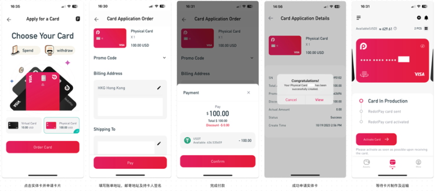 RedotPay 卡的申请步骤相对简单,全部步骤都可以在 RedotPay App 上完成。首先用户需要在 Apple Store 或 Google Play 下载 RedotPay App,并于 App 完成身份验证就可以在卡片申请界面申请实体卡或虚拟卡。同时,申请卡片的相关费用需要用户提前充值相应数额的加密货币至 RedoyPay 钱包才可以完成申请。 注意,RedotPay 不提供服务予部分国家及地区的居民,请在身份验证及充值前查阅其官网相关信息。以下是相关申请步骤:
