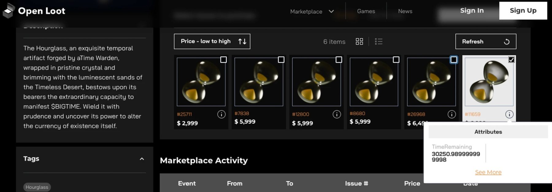 玩家通过购买市场上空的沙漏,再把它们充能,再卖给有需求的玩家,从中获利。以传奇等级的沙漏为例,目前一个剩余时间 414.97 分钟的,售价为 2999 美元,而时间沙漏剩余时间较多的比如 30200 分钟的,则售价 6999 美元。
