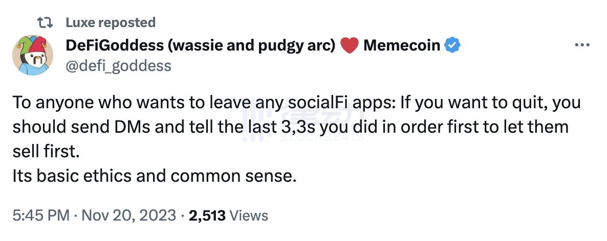 friend.tech 本身不是一个内容生产和社交关系强绑定的平台,只是推特衍生出来的金融产品,而不是社交产品,这也是 friend.tech 暴利的关键。friend.tech 协议没有要求 KOL 进行内容生产,来购买 key 的用户也不是过来消费内容的,KOL 本身似乎也不需要对用户的 key 负责,看似很弱的社交关系实际上被 friend.tech 的金融属性完全掩盖掉。