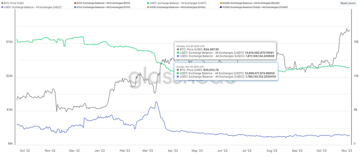 过去一周,USDT 在交易所的存量从 138 亿下降到 136 亿美金,净流出 2 亿美金。USDC 从 18.1 亿美金下降到 17.8 亿美金,净流出 3000 万美金。所以,上周 USDT 增发了 9 亿美金,但是却从交易所净流出 2 亿美金。所以增量资金青睐于链上买入,而不是进入交易所。
