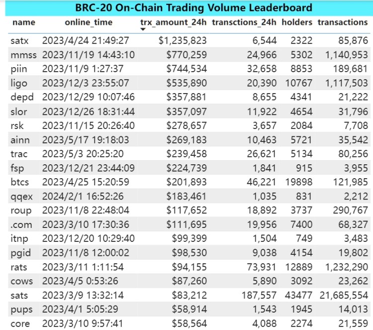 MMSS(Token):项目做年轻人的艺术社区,代币已经完成 mint,目前 24 小时的交易量 77 万美金左右。项目近期发行 Ordinals 协议的 BTC 资产。项目有持续运营能力,可以持续关注。