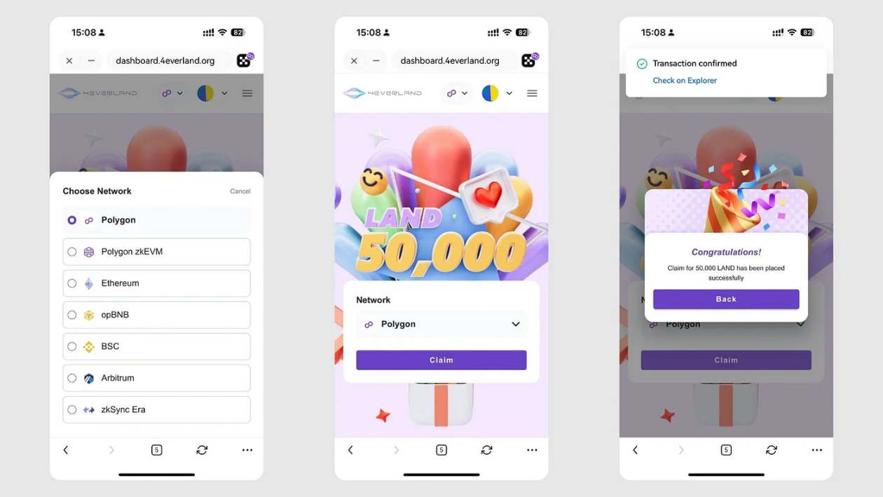 OKX 钱包用户通过“Claim LAND”链接访问 4EVERLAND 可获得 50,000 LAND 奖励,可用于体验 4EVERLAND 平台。选择您最常使用的区块链网络。然后点击“Claim”按钮。