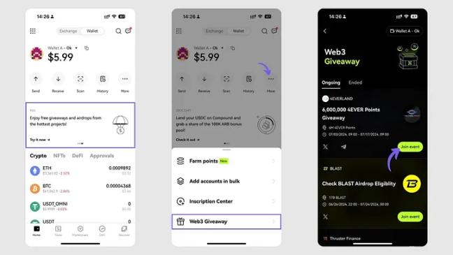 首先,进入 OKX App,点击右上角切换到钱包页面,在首页找到活动的入口。
