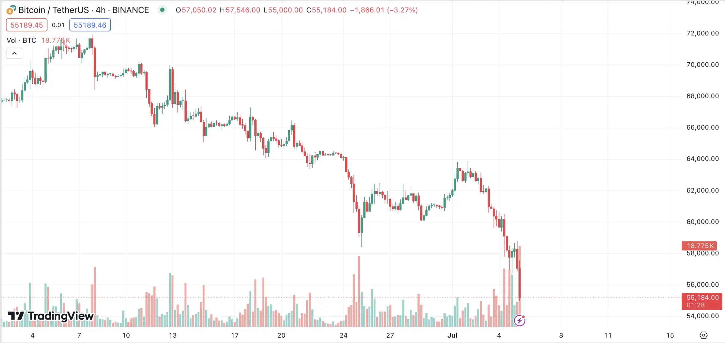 6 月 24 日,比特币跌破短期高位 64,000 万美元。今日,比特币又跌破 54,000 美元,24 小时跌幅扩大至 8.8%。「6·18 大促」持续至今,遭 7·5 暴跌,迎来属于币圈人的黑色星期五。