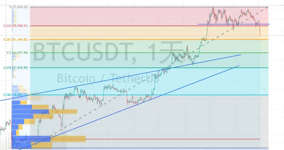 基于斐波那契回撤工具,比特币价格在回调过程中可能会在 51,500 美元左右找到支撑。这个价格点位对应于斐波那契回撤的 38.2% 水平(即从近期的高点到低点的 38.2% 的位置)。此外,这个价位区域之前也曾是比特币价格在最后冲刺前进行短暂盘整的地方,这进一步增加了 51,500 美元作为支撑位的可能性。