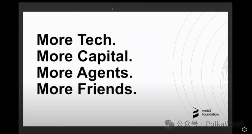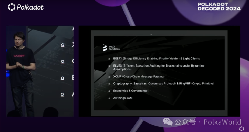 在 Polkadot Decoded 2024 大会上,来自 Web3 基金会的 Fabian Gompf 介绍了 Web3 基金会的最新动态和策略,包括在 Polkadot 生态系统中推动更好技术、增加资本、支持独立代理人以及建立更多合作伙伴关系。