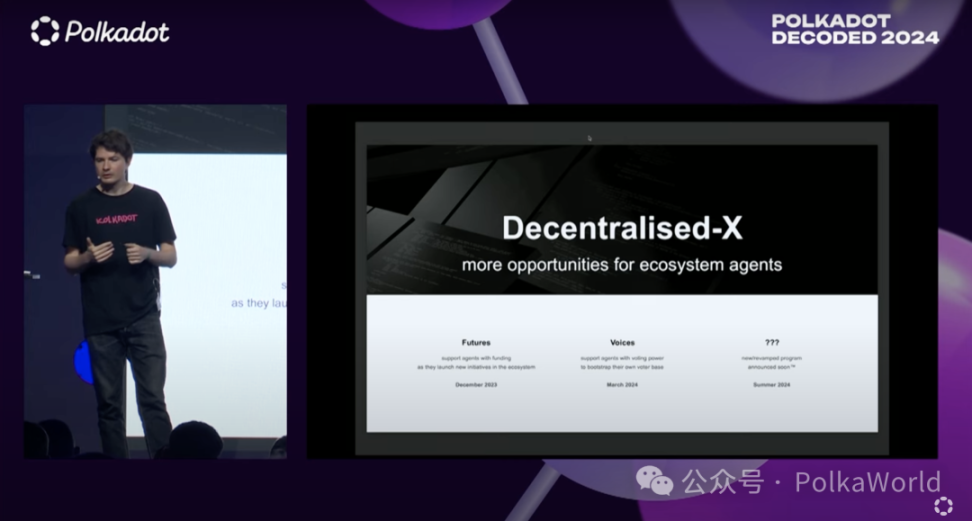 这些是我们在基金会内非常关心的 Polkadot 生态系统中的事情,我会逐一讲解这些内容并提供一些背景信息。我会从代理人开始,因为这是这次演讲的主要主题,也是我们过去六个月中最重要的目标之一。我认为这确实是重新编织 Polkadot 社会结构的关键。