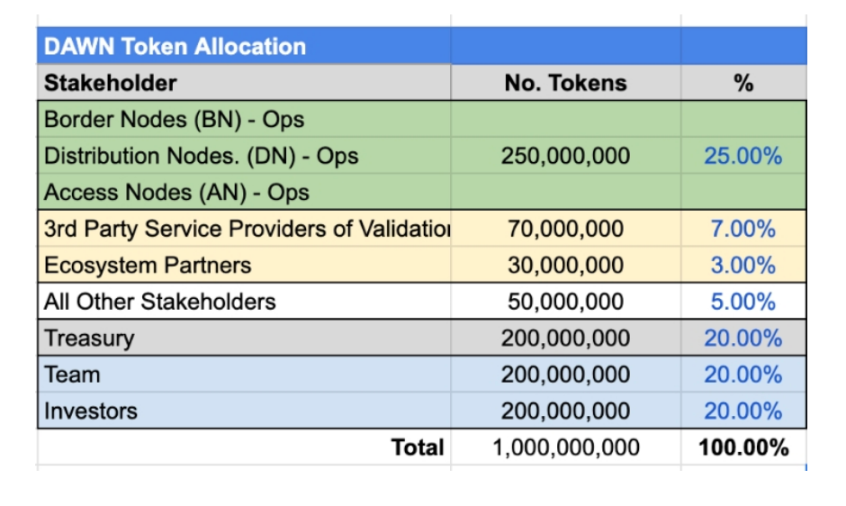 DAWN 代币目前分配情况:各类网络节点(即硬件设施参与者),将获得代币总量 25% 的奖励;第三方验证者(即软件设备参与者)将获得代币总量的 7% ,项目金库、团队和投资者占有 20% ,代币解锁时间未知。