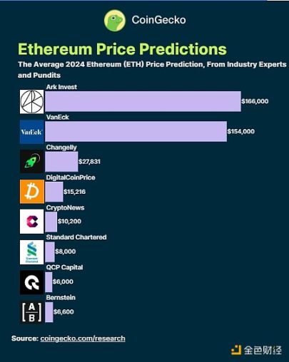 所有八位预测者都看好以太坊,并预计 ETH 将上涨至 4,400 美元至 166,000 美元之间。CryptoNews 的最低目标为 4,443.63 美元,而 Ark Invest 的 Cathie Wood 的最高目标为 166,000 美元。虽然所有专家都预计价格会上涨,但只有两位预测 ETH 将达到六位数。VanEck 预测 ETH 在看涨情况下将升至 154,000 美元,而 Cathie Wood 预计它将升至 166,000 美元。然而,大多数价格预测都基于较长的时间范围,只有 Bernstein、QCP Capital 和渣打银行提供了一年内的时间范围。因此,他们的预测也往往在 6,000 美元至 8,000 美元的低端。