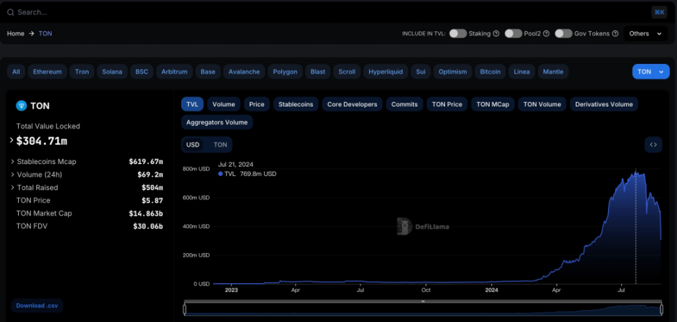 截止撰稿时,据 Coingecko 数据显示,TON 代币价格下跌至 5.83 美元, 24 小时跌幅达 13.3% ,市值目前为 147.4 亿美元,仍位列加密货币代币市值排名第十的行列;DefiLlama 数据显示,TON 网络 TVL 已从 7 月 21 日的 7.7 亿美元下跌至如今的 3.04 亿美元左右,生态 TVL 减少超 50% ,市场避险情绪强烈。