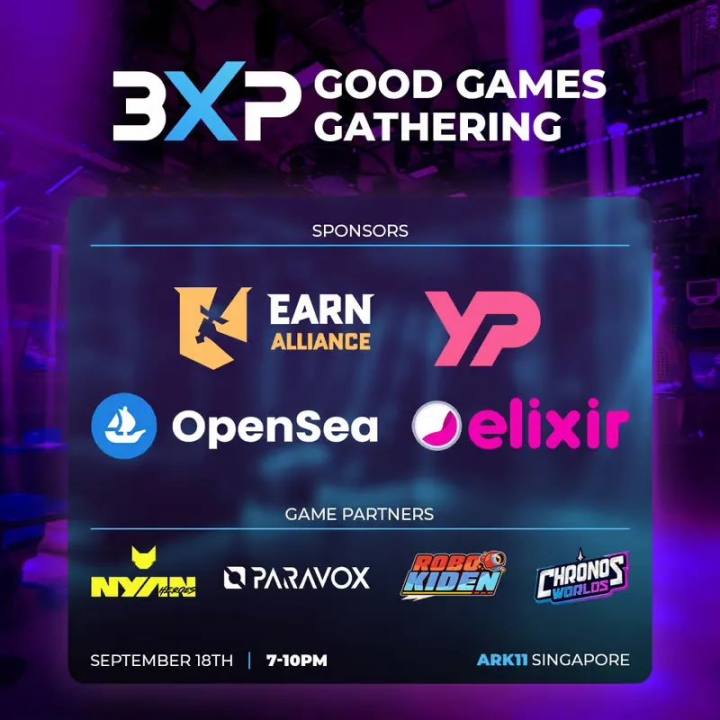 📅 活动时间:9 月 18 日星期三 19:00 ~ 22:00(UTC+8)📍 活动地点:ARK11, 181 Orchard Rd, #11 - 01 / 02 Orchard Central Singapore🕹️ 在 Token2049 期间加入 3XP、OpenSea、Elixir 和 Earn Alliance,参加一个以游戏为重点的讨论、社交、饮品和 Nyan Heroes、PARAVOX、Chronos 和 RoboKiden 游戏测试之夜!🎮 Ark11 场地 - 其具有航天器隧道和人工智能酒吧的未来主义设计使其非常适合 web3 网络。👥 Web3 游戏思想领袖、游戏开发者和像 Yellow Panther 这样的创作者将出席。Nyan Heroes 是一款开创性的竞技射击游戏,游戏中的 CATS 驾驶巨型机甲,NYAN HEROES 由曾参与 Halo、Destiny、Mass Effect 和 Assassin's Creed 等游戏开发的业内资深人士开发,被誉为 web3 射击游戏的巅峰之作。Chronos 的程序化 AI 生成世界让您可以在 PvE 地牢中与怪物战斗,并在实时 PvP 比赛中与敌方玩家竞争,Chronos 的终极动作平台游戏专为移动设备(Android 和 iOS)打造,多人游戏是体验的核心,也可在 PC 和 Mac 上使用。RoboKiden 是一款创新的团队动作游戏,五名玩家合作控制一台机甲,参与战略战斗,成为最终的机器人霸主,该游戏采用区块链技术,使用 KIDEN 代币进行游戏内交易和 NFT 交易,以独特的经济和游戏功能增强游戏体验。PARAVOX 是一款免费的高速 3vs3 第三人称射击游戏(TPS),将快速战斗与战略游戏相结合,玩家使用各种武器和技能来占领地图上的点,自 4 月在亚太地区试运行以来,该游戏已积累了超过 10 万次安装和超过 20 万社交媒体粉丝,PARAVOX 最近在全球范围内发布了 alpha 版本,开启了与 web3 领域的大规模合作,电子竞技和 web3 的新交汇点呈现在世界面前。3XP 是 Web3 游戏的首要营销目的地,我们的使命是通过汇集创新内容和行业先驱来加速 Web3 游戏行业的增长和成功,通过电子竞技锦标赛、互动展位以及工作室和游戏玩家的交流机会,沉浸在游戏的未来中。Elixir Games 是一家科技公司,其团队分布在欧洲、亚洲和美洲,自 2018 年成立以来,Elixir Games 一直处于区块链相关游戏发行的前沿,目前,它拥有功能最强大、内容最丰富的发行平台 Elixir(launcher.elixir.app),该平台提供近 120 款合作 PC 游戏,并完全集成 web2 和 web3,让用户可以轻松访问数千款游戏,有关 Elixir Games 的更多信息,请访问其官网。Earn Alliance 是最大的 Web3 游戏聚合器和发现平台,彻底改变了游戏玩家与 Web3 互动的方式,凭借庞大的用户群和创新的参与策略,Earn Alliance 正在传统游戏和区块链技术之间架起一座桥梁,促进游戏玩家无缝过渡到 Web3 领域。YellowPanther 是顶级 Web3 游戏内容创作者、天使投资人和顾问,他是 Mocaverse 的大使,并为 Pirate Nation、Carv 等一些顶级项目提供咨询,凭借其广泛的人脉,他帮助许多游戏在亚洲和全球上市。📸 活动期间将拍摄照片和视频,参加活动即表示您同意被录制。
