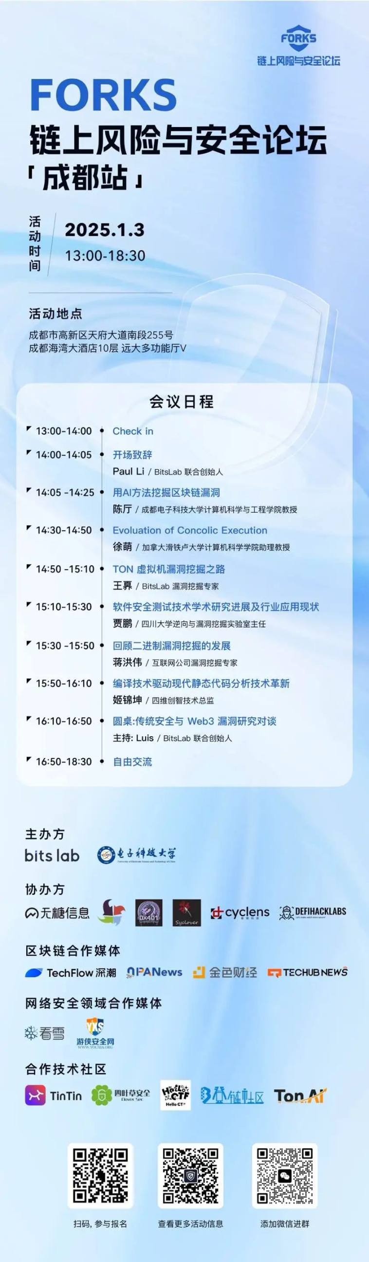 本次论坛由 BitsLab 和 电子科技大学 联合主办,无糖信息、CNSS、0x401、三叶草、cyclens 以及 DEFIHACKLABS 协办,深潮、PA News、金色财经、TechHub News、看雪、游侠安全网等区块链以及网络安全媒体持续关注。还有 TinTinLand、四叶草安全、HelloCTF、登链社区以及阿拉丁等社区的友好支持。学术界、产业界多方力量共同汇聚,不仅能掌握前沿网络安全研究动态,还能探寻落地应用的无限可能。