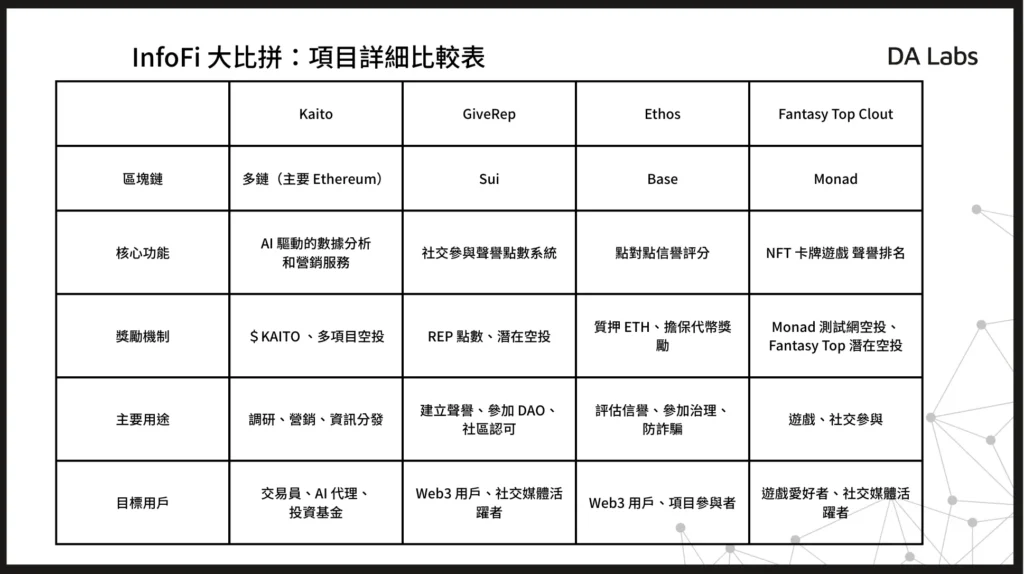 繼 Kaito 開響第一炮的成功示範後,各鏈生態中類似 Dapps 如雨後春筍般冒出。本文將介紹介紹比較 GiveRep、Ethos 和 Fantasy 等各鏈 InfoFi,統整並推薦讀者一魚多吃的嚕法,體驗 InfoFi 有趣的玩法和空投之外的收益。
