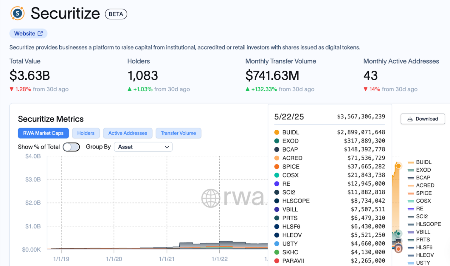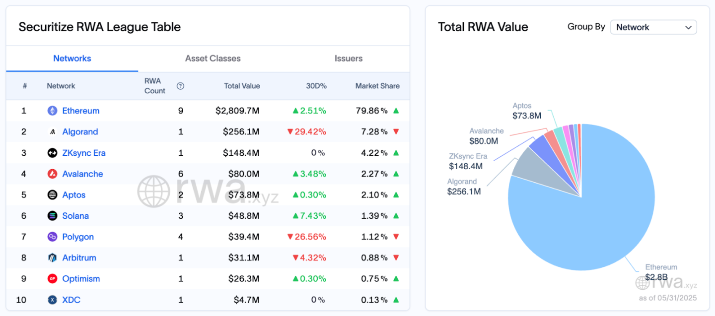 Securitize 代幣化資產在各鏈的分佈狀況,來源:RWA.xyz
