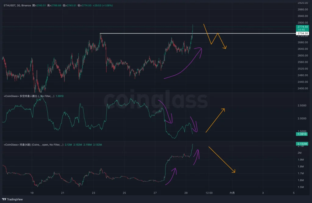 ETH 在期貨數據上的表現對於多而言是非常樂觀的,多空比降低搭配持倉量的堆升(紫色箭頭),意味著擁有較多資金的少部分人進場多頭部位(大戶做多),促使 ETH 在短時區進入更強勢的多頭表現。