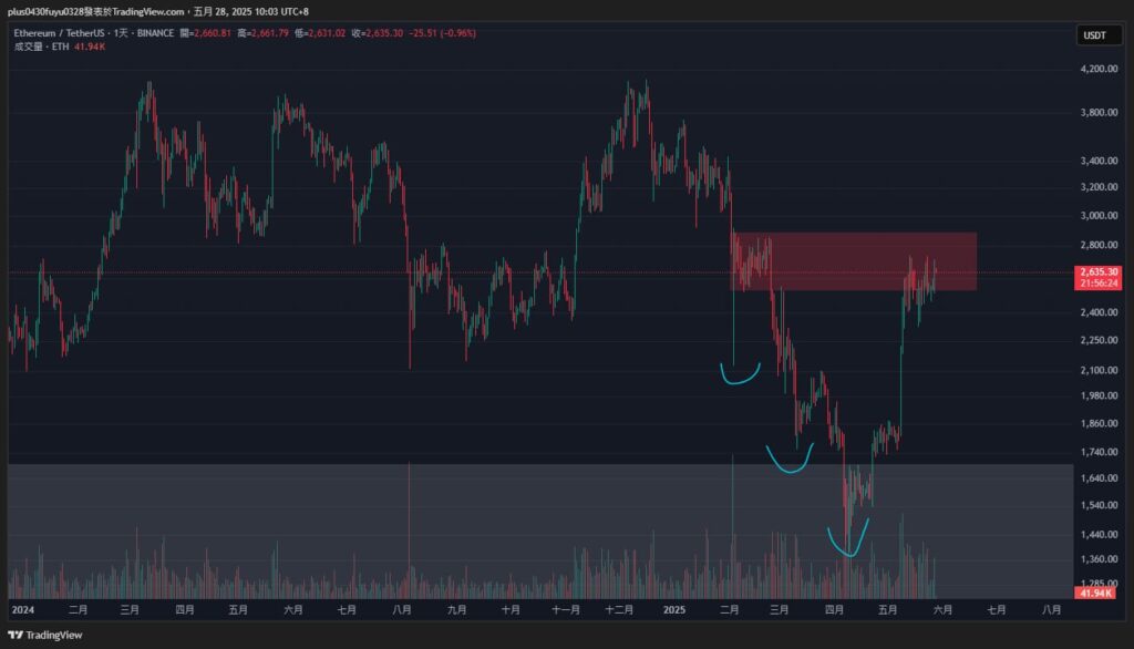 ETH 以日線級別來說,走勢較為劇烈,先是一波下跌形成三推,後續又在沒有明顯反轉型態時爆力拉升了 1000 點左右,目前受阻於這波起跌點的壓力區,但相較於 BTC,ETH 的上漲動能更相明顯,筆者認為若 ETH 能夠在這價格區間持續消耗賣盤,後續還是有上漲的空間。