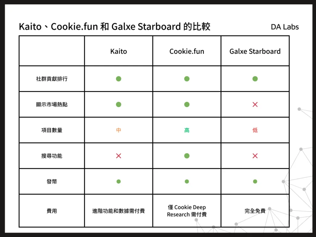 Kaito 的變現能力經過市場驗證,為其建構起深厚的護城河,同時也是 Cookie.fun 和 Galxe Starboard 尚需證明自己的地方。如若無法引發相應的財富效應,即便功能再齊全,也難以和 KAITO 做抗衡。