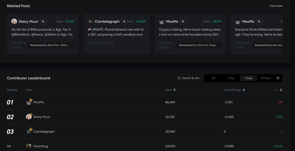 用戶可以在 X 上輸出與項目相關聯的內容來累積 Aura 積分。與 Kaito 和 Cookie.fun 相比,目前 Galxe Starboard 的介面相對簡單,僅能查看這 14 個項目各自的排行榜、X 貼文和總排行,除此之外就沒有其他額外功能。