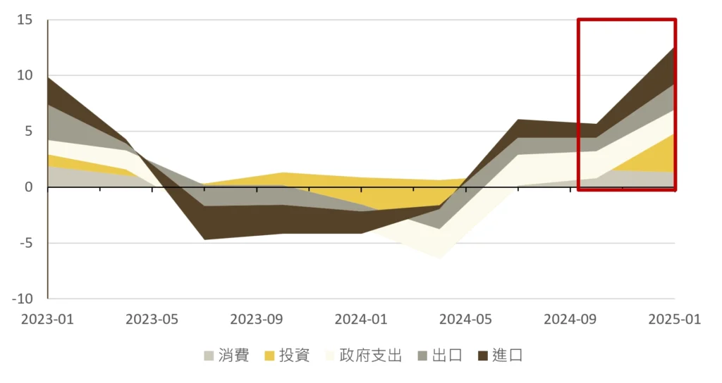 川普 1 月 20 日上任後即揚言要對關稅開刀,帶動製造業提前拉貨潮,中間雖然暫緩但隨對等關稅延後 90 天,提前拉貨的情況仍然持續。近期公布歐元區 1Q25 的 GDP 成長率估計為 0.6%,較上次的 0.3% 明顯上修,上修第一季 GDP 成長率的原因就是因為提前拉貨潮。