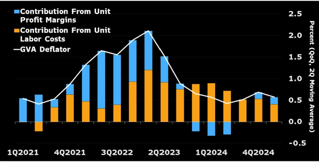 若從國民經濟核算報告中,與 2022 年及 2023 年相⽐,獲利成⻑ ( 藍 ) 已顯著放緩,不再對歐元區通膨產⽣重⼤貢獻,預期為未來也將保持放緩。而當中的勞動成本 ( 橘 ) 對於通膨貢獻也正在減弱。
