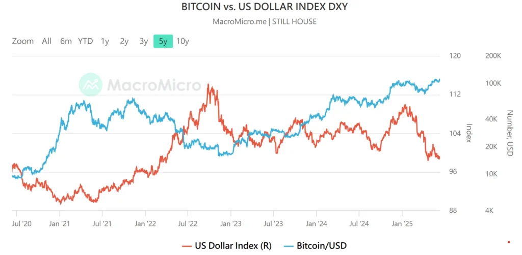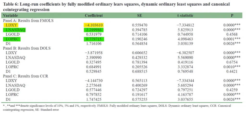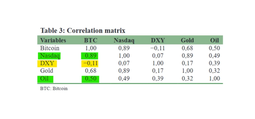 從圖可知 BTC 與美元指數近五年的表現呈現負相關,另外在 The Relationship between Bitcoin and Nasdaq, U.S. Dollar Index and Commodities 這篇論文調查 2017 年至 2023 年的數據,一樣觀察到「BTC 與美元指數」呈現顯著負相關的相同結論,另外也發現 BTC 與那斯達克指數、BTC 與油價存在顯著正相關,BTC 與黃金相關性不顯著。