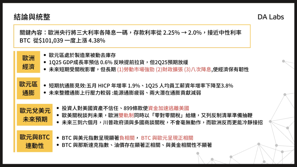 此消息一出,截至週五,比特幣從 $101,039 一度上漲 4.38%,從歷史經驗不難可看出當降息、市場熱錢變多時,加密貨幣市場大多會受惠於此,這次歐洲央行降息也不例外。但除此之外,本篇文章將帶你了解歐洲經濟現況、未來降息預期以及 BTC 與歐元竟然存在正相關的驚人發現。