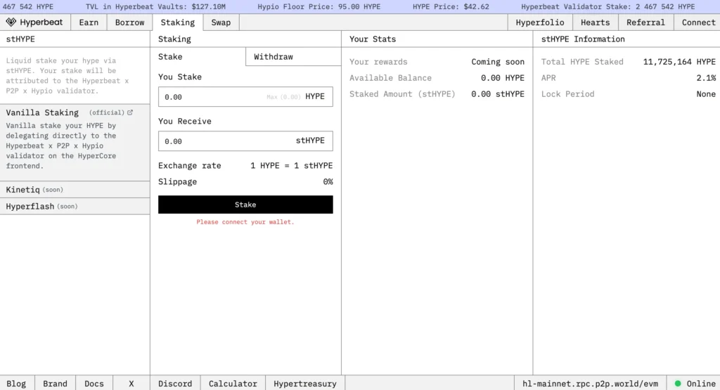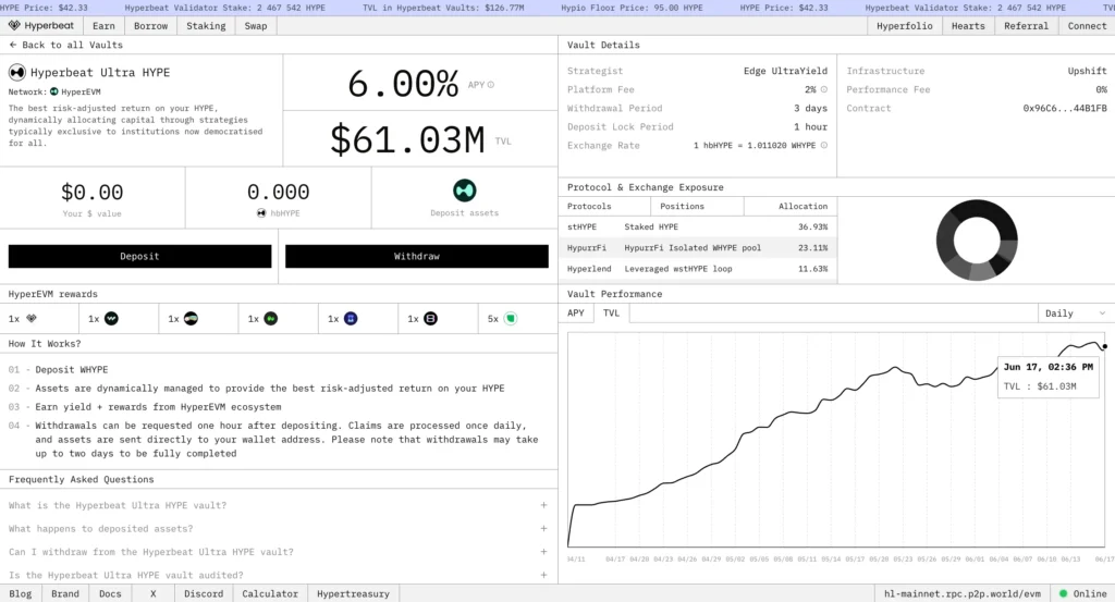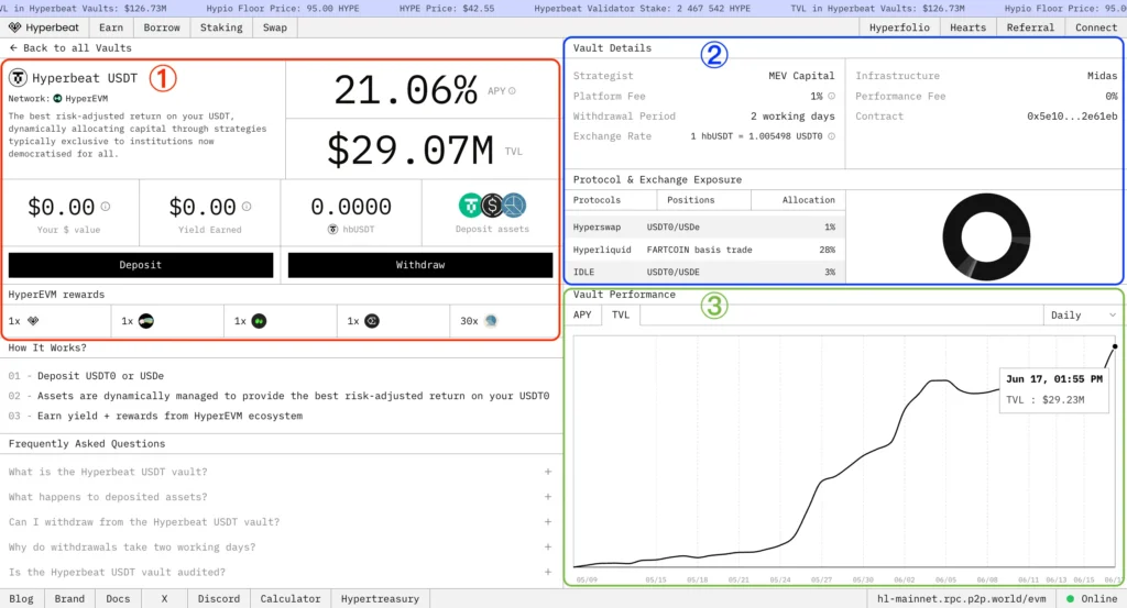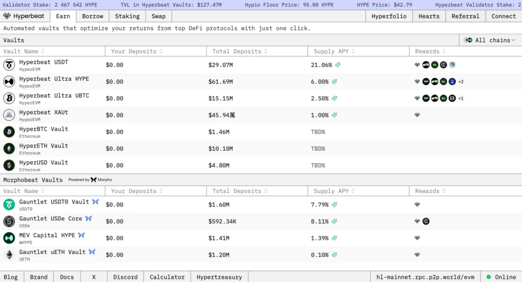Hyperbeat 是一個 HyperEVM 生態的一站式收益聚合協議,提供收益金庫、流動性質押、借貸和代幣兌換等多個服務,讓用戶可以在 Hyperbeat 完成所有 DeFi 操作,並利用不同策略最大化資金使用效率。