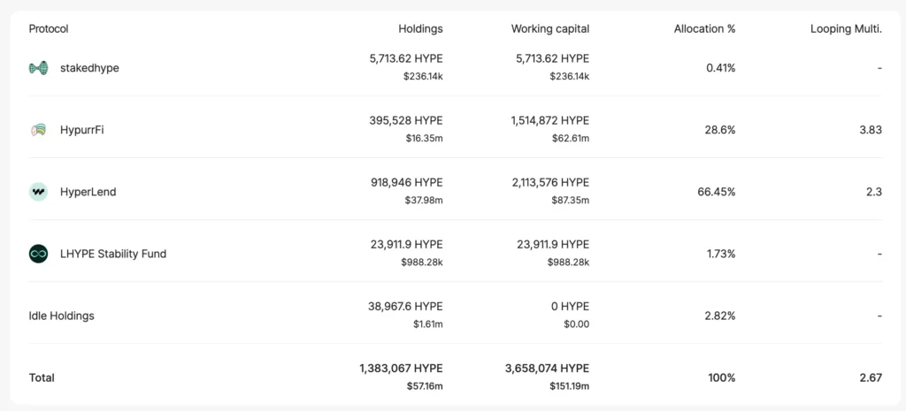 Looped HYPE 是一個流動性的收益聚合協議,用戶將 HYPE 存入 Looped HYPE 並獲得 LST 代幣 LHYPE。接著 Looped HYPE 會將存入的 HYPE 自動分配至 Hyperliquid 生態中的各個 DEX、借貸和流動性質押協議中,利用循環質押或借貸的方式放大部位的資金使用率,以此提高整體的 APY(目前為 3.5%)和各個項目的積分加成。其策略和分配比例如下: