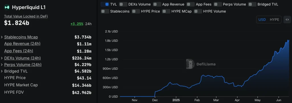 圖 2、Hyperliquid L1 的 TVL,圖源:DefiLlama